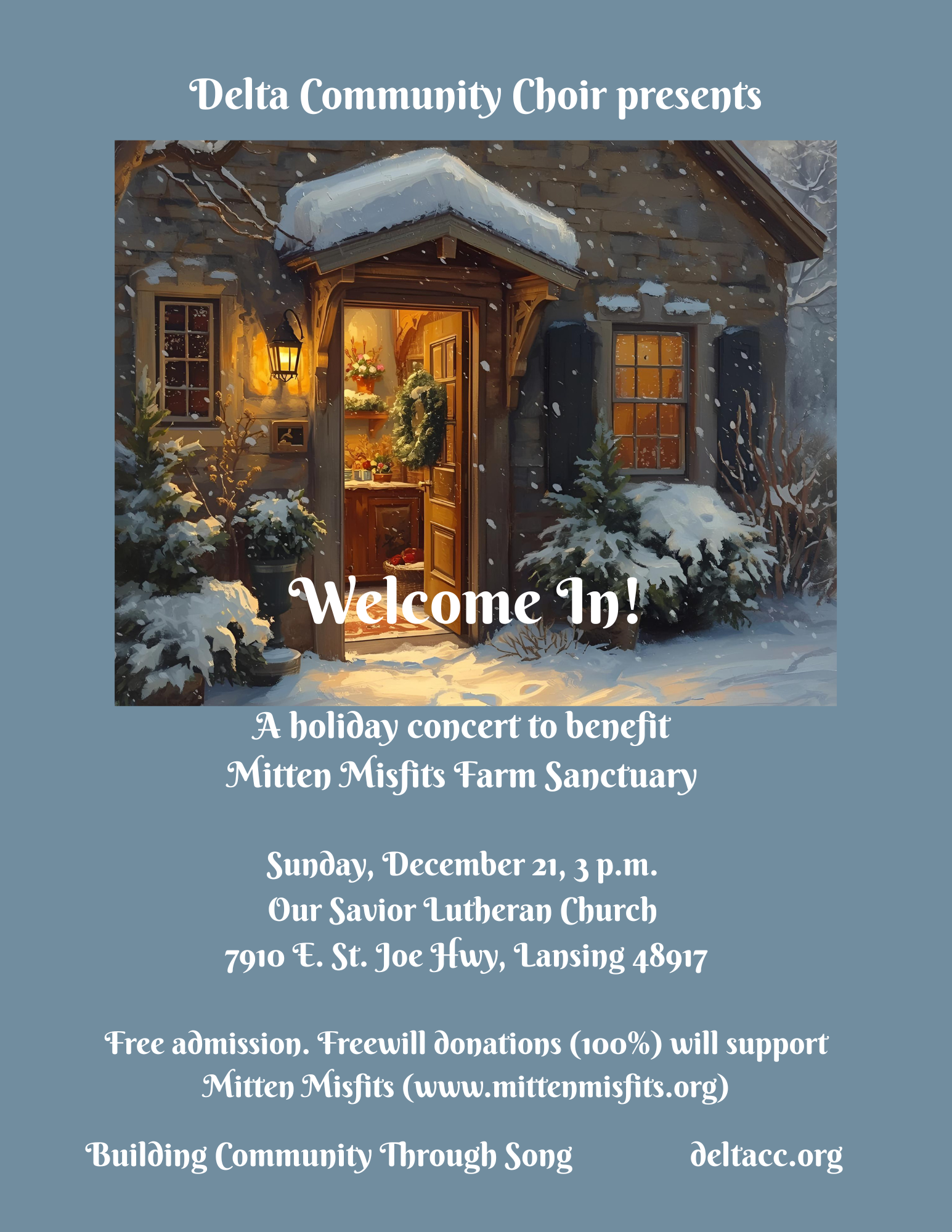 Delta Community Choir will present its winter concert, “Welcome In!” on Sunday, December 21 at 3 p.m. at Our Savior Lutheran Church, 7910 E. St. Joseph Highway, Delta Township. Led by music director Zach Everly and accompanist Christine English, the 58-voice Delta Community Choir will “Welcome In” the holiday season with a repertoire of traditional carols, gospel hymns, music from the movies, and even some holiday humor.