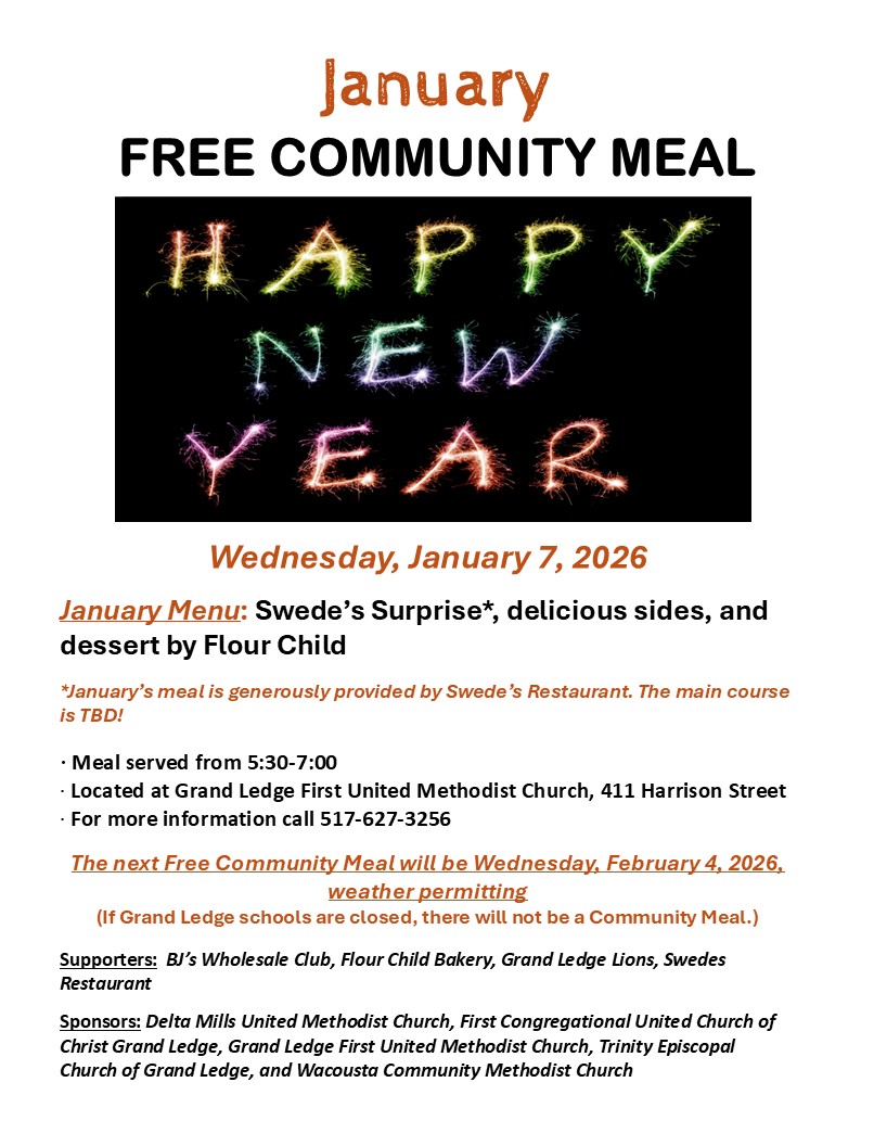 The next Free Community Meal will be Wednesday, January 7, 2026. The January menu is TBD, but the meal is being generously provided by Swede's Restaurant, so it will be delicious!