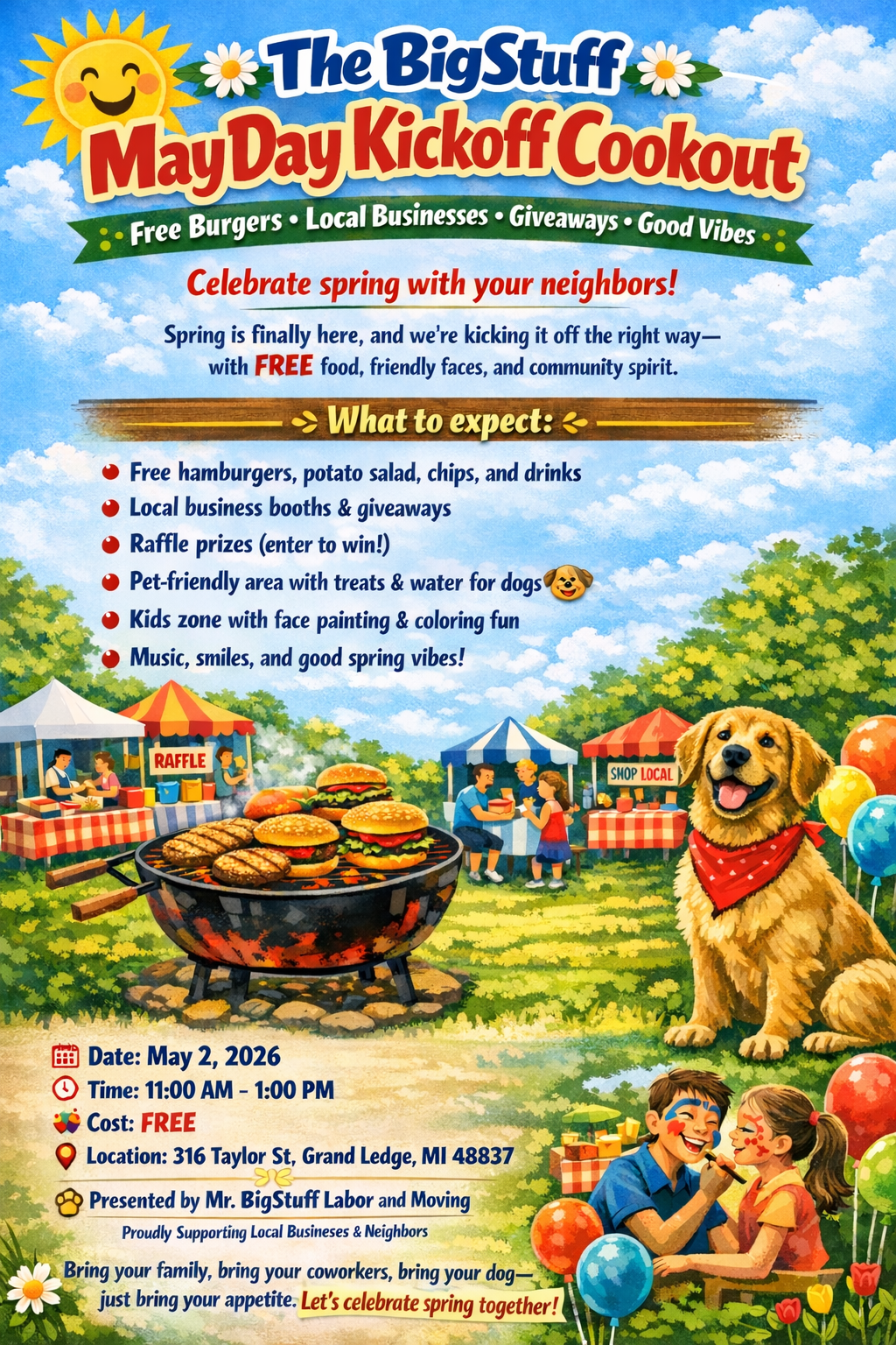 Join us for The BigStuff MayDay Kickoff Cookout, a laid-back, family-friendly event hosted by Mr. BigStuff Labor and Moving to celebrate the start of spring and support local businesses and neighbors.